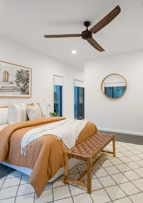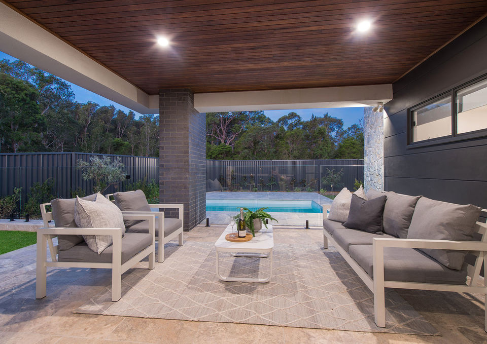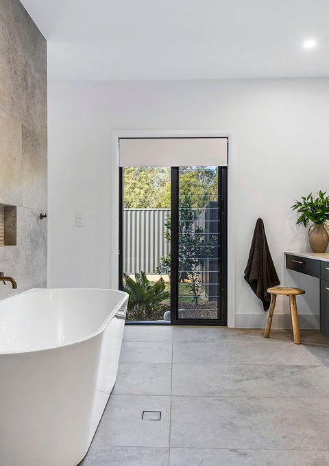 Every element has been considered with precision — from the individually zoned ducted air-conditioning system to the 3000-litre water tank, mud room, and double garage with integrated storage. The external environment is equally resolved, featuring riverbed-inspired landscaping, travertine tiling, and PGH Pewter clay bricks — the same timeless material palette celebrated on The Block — creating cohesion between architecture and landscape.